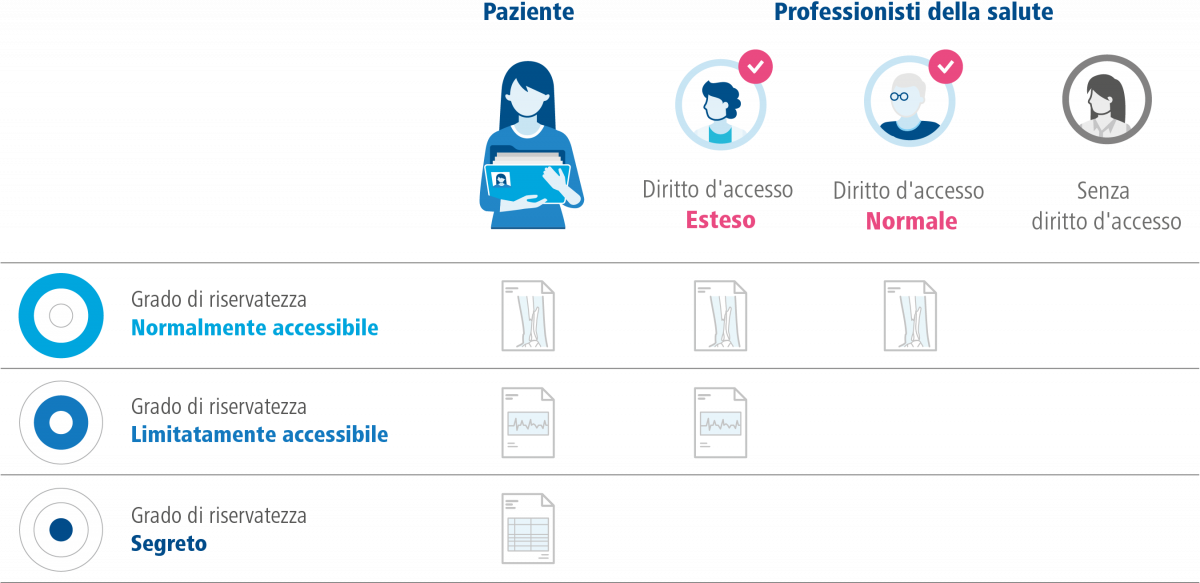 Se non diversamente impostato, ai nuovi documenti viene attribuito di default il grado «normalmente accessibile». Qualora si tratti di informazioni sensibili, un professionista della salute può in alcuni casi attribuire a un documento il grado di riservatezza «limitatamente accessibile».